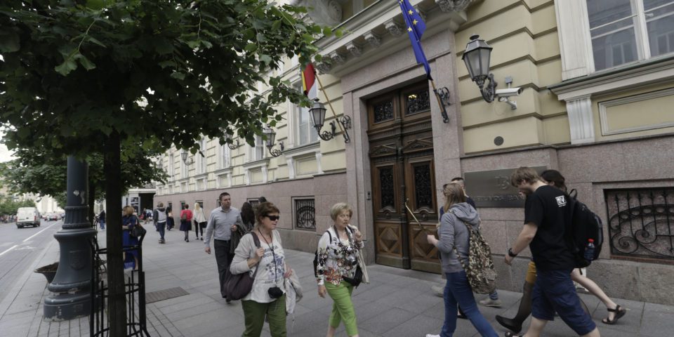 CONTIS: The Lithuania central bank has fined UK financial services provider Contis €840,000 for AML failings. File photo shows passersby walk past Lithuania's central bank office in Vilnius.