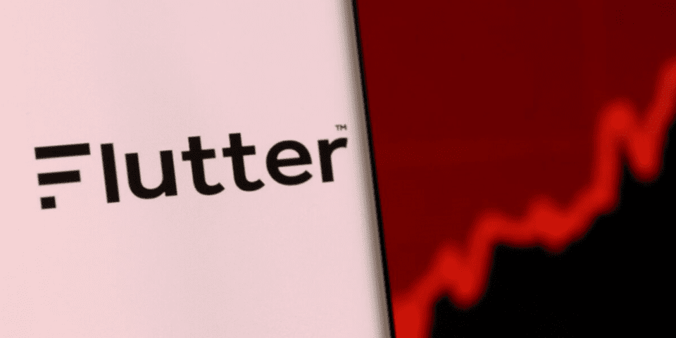 Flutter's logo is pictured on a smartphone in front of the stock graph displayed in this illustration taken, December 4, 2021. REUTERS/Dado Ruvic/Illustration/File Photo