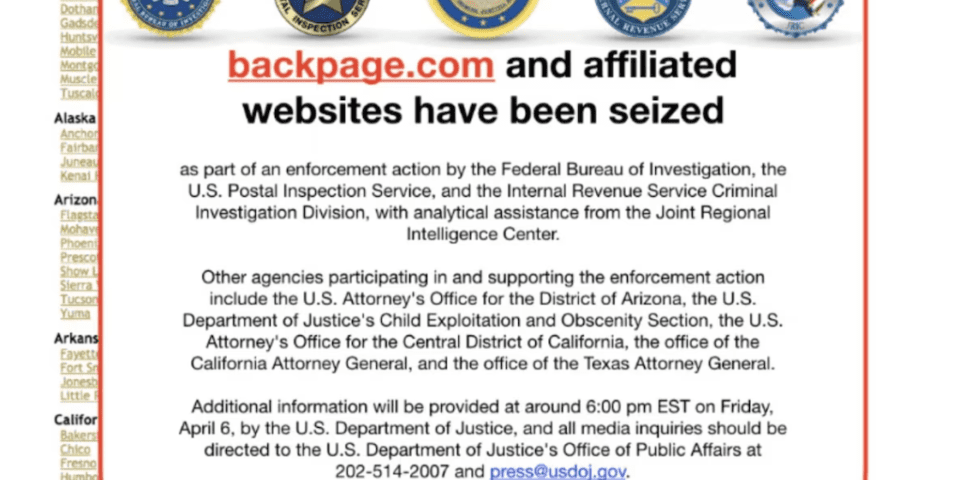 Authorities shut down Backpage in April 2018 after finding it hosted widespread advertising for commercial sex, including trafficking of minors.