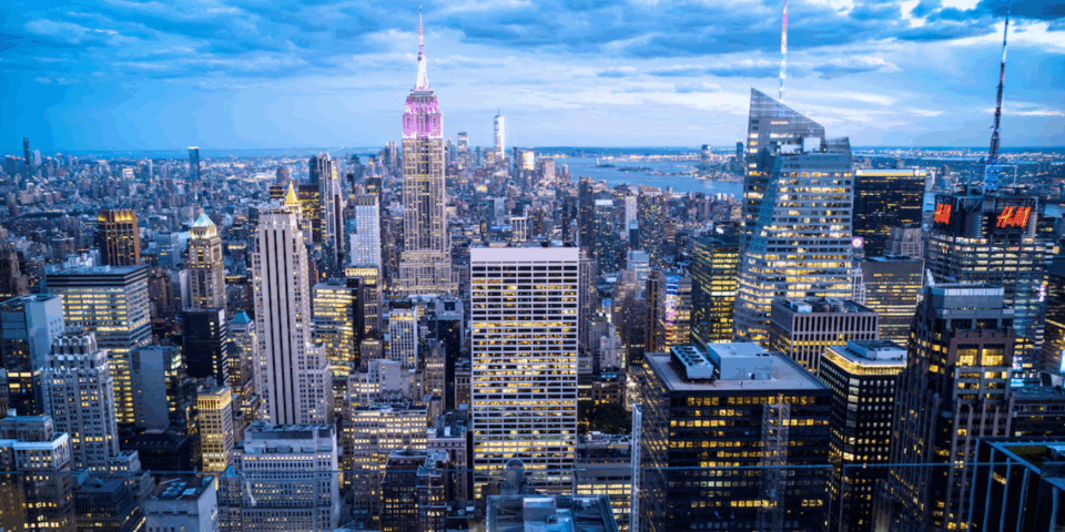 People enjoy the Manhattan skyline during sunset, from the Top of the Rock observation deck, at Rockefeller Center, in New York, U.S., June 28, 2022. REUTERS/Athit Perawongmetha/File Photo